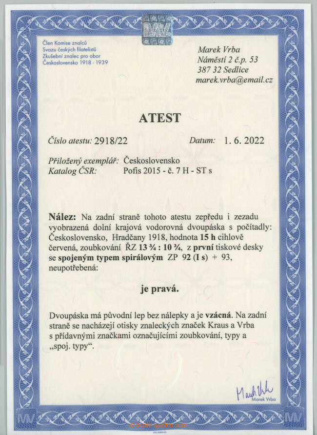 | Zusatzinformationen und Suchstichworte: | Burda 69. Auktion 10. - 11. September 2022 Los 2196 Tschechoslowakei 1918-1939 Pof. 7H beigetreten spiralförmigem Typen, 15h wie ein Ziegel rot, die unten waagrecht marginale Pr mit control-numbers, Linienzähnung 13¾ : 10¾, spiralförmigem Typenkombination (!) spiralförmigem Type I auf Pos. 92/1; postfrisch postfrisch, Attest Vrba, exp. Kraus, wirklich selten bietest spojeneho spiralförmigem Typ in vzacnem gezähnt, Artikel zu größte specializovanych Sammlungen! Zuschlag 7.600,00 EUR |