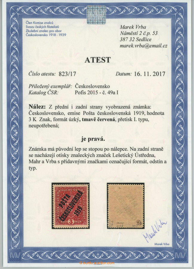 | Zusatzinformationen und Suchstichworte: | Burda 69. Auktion 10. - 11. September 2022 Los 2352 Tschechoslowakei 1918-1939 Pof. 49a I, Wappen 3 Koruna dunkelrot, Aufdruck-Type I. ; außerordentlich schön Briefstücks mit einwandfreie centrovanym Überdruck; kleiner Falz, Attest Vrba, exp. Bei Mahr. Leseticky, feine und seltene Marke! Zuschlag 2.400,00 EUR |