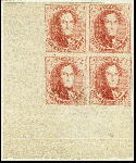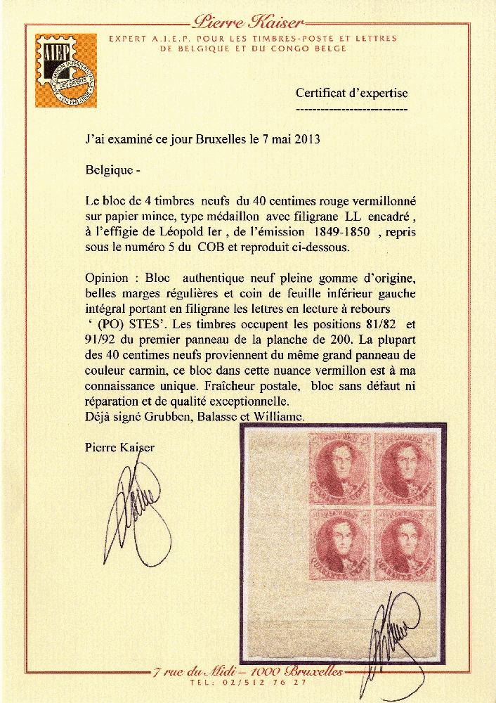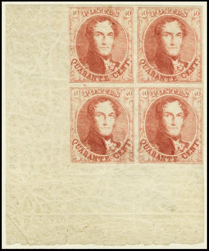 | Zusatzinformationen und Suchstichworte: | Stockholmia 2019 & Erivan 1. Juni 2019 in Stockholm Los 22 1849 (OCTOBER 17), 40 c. carmine-vermilion, the famous unused corner block of four from the lower left of the sheet, positions 81-82 / 91-92, on the sheet of 200 stamps, on thin paper with watermark 'LL' in frame and sheet marginal watermark (PO)STES at left, large even margins all around and stamps of fabulous rich colour, trivial corner bend in margin only and slight closed nick in margin at base mentioned for full accuracy, minor wrinkling on large part original gum with lower pair unmounted o.g. A wonderful multiple of outstanding freshness and the sole recorded mint multiple in this resonant shade. Unique. Signed Grubben, Balasse and Williame. Certificate Pierre Kaiser AIEP (2013) (COB 5) Ausruf 75.000,00 EUR |