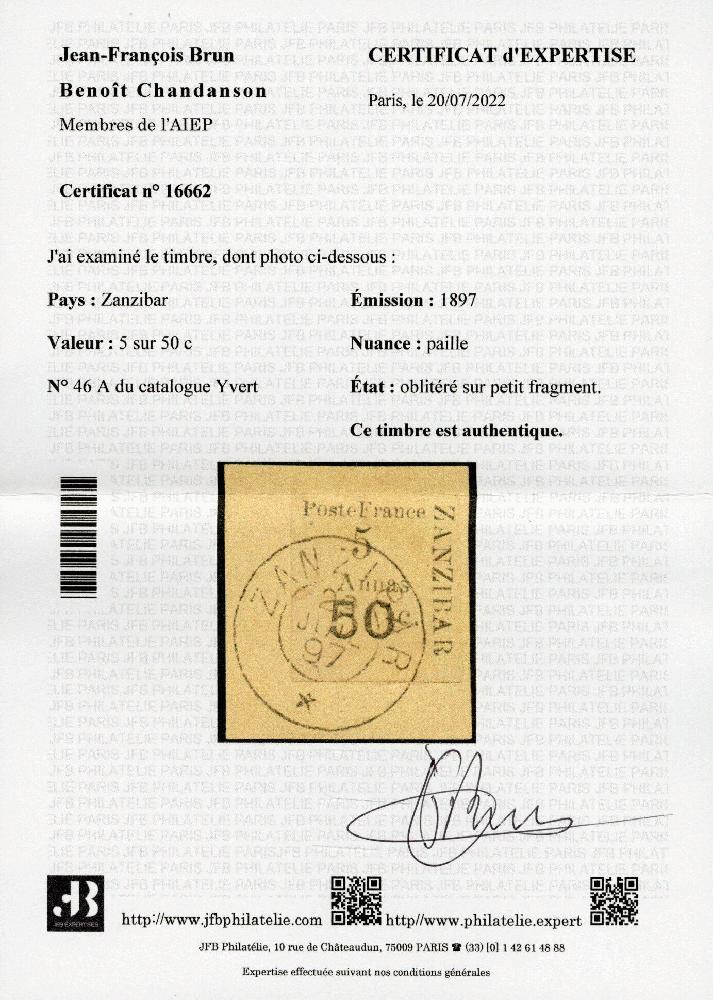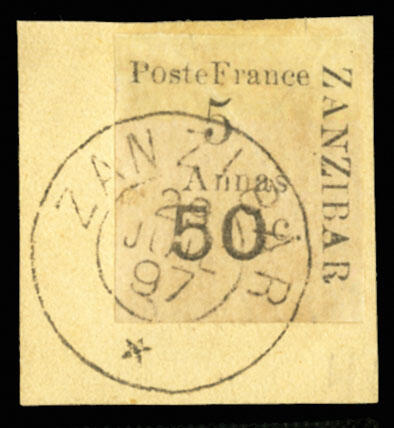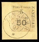 | Zusatzinformationen und Suchstichworte: | Cherrystone - Rare Stamps and Covers of the World 13. - 14. September 2022 Los 488 Französische Post in Zanzibar 1897 5a and 50c black on white paper, type IV, imperforate single canceled on piece, signed Brun, with 2022 certificate. A very rare stamp, only 5 (!) recorded, A major French Colony and Offices in Zanzibar rarity (YT 46A) (Catalog value €21,000) Zuschlag 14.000,00 USD |