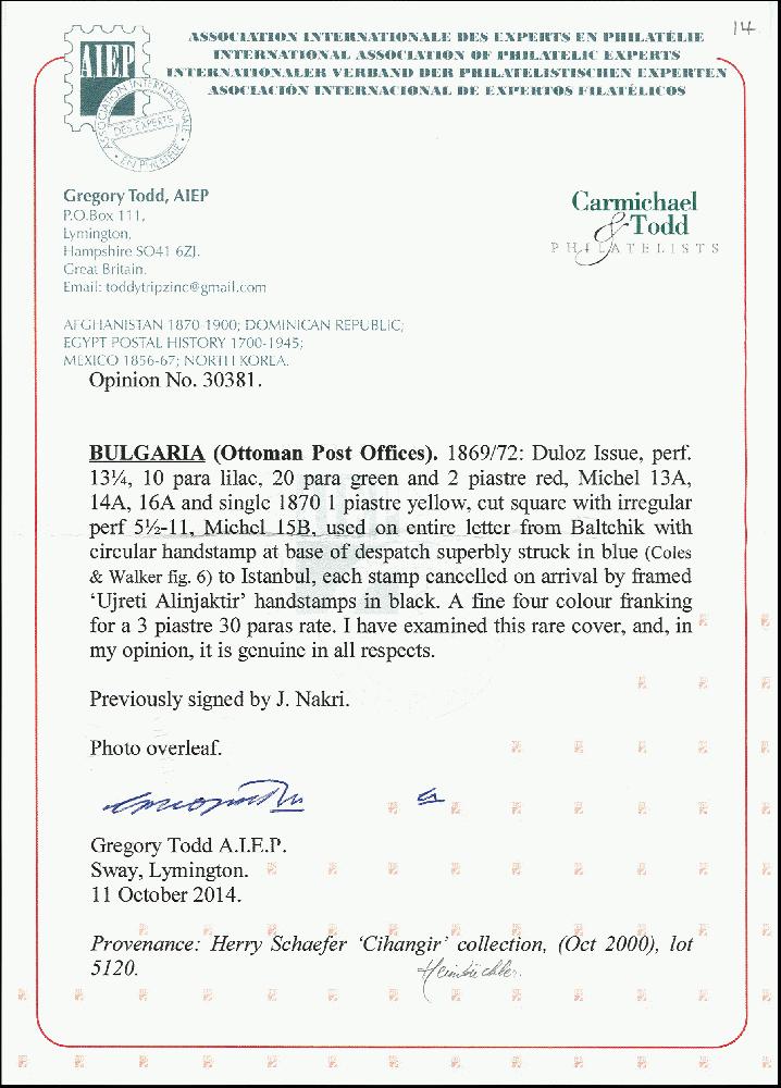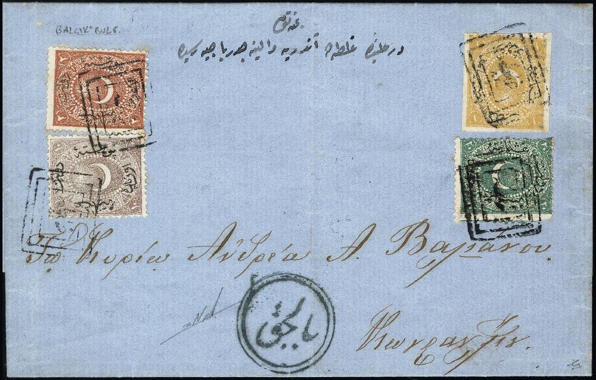 | Zusatzinformationen und Suchstichworte: | 378. Auktion Heinrich Köhler Auktionstermin 21.-26. März 2022 Los 4008 „Balcik“, all arabic double circle in blue on entire letter to Constantinople, franked with Duloz 2 pia. red, 1 pia. Yellow, 20 pa. green and 10 pa. lilac, cancelled upon arrival with framed „Ujreti Alinjaktir“, very fine and scarce, signed Nakri, opinion Todd AIEP Zuschlag 700,00 EUR |