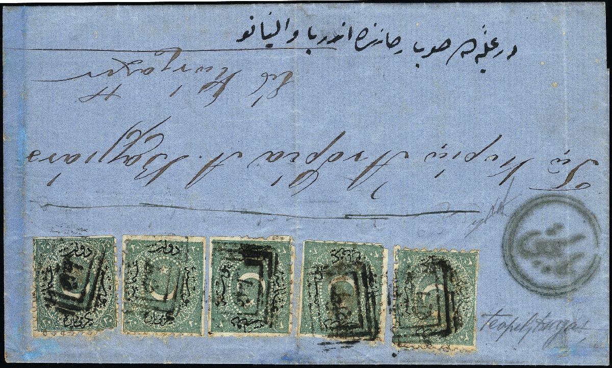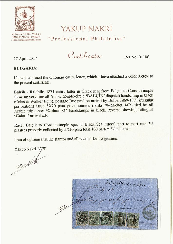 | Zusatzinformationen und Suchstichworte: | 378. Auktion Heinrich Köhler Auktionstermin 21.-26. März 2022 Los 4010 „Balcik“, all arabic double circle in blue, clear strike on entire letter, franked with 5 copies Duloz 1869/70, 20 pa. green to Constantinople. Fine and scarce letter with special black sea littoral port to port rate . Certificate Nakri AIEP Zuschlag 700,00 EUR |