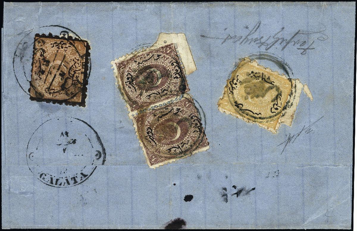 | Zusatzinformationen und Suchstichworte: | 378. Auktion Heinrich Köhler Auktionstermin 21.-26. März 2022 Los 4014 „Bergos“, all arabic double circle, 3 good strikes in blue, tying Duloz 1868/71, 1 pia. yellow and 10 pa. In horizontal pair with part of sheet margin to letter sheet to Constantinople; here franked with postage due1pia. for local delivery, tied by Galata cds. Fine and rare entire. Certificate Nakri AIEP.(Isfila RR) Zuschlag 850,00 EUR |