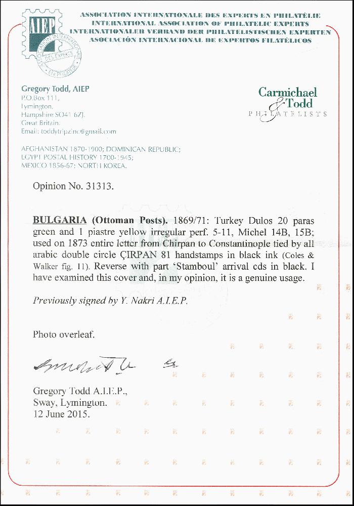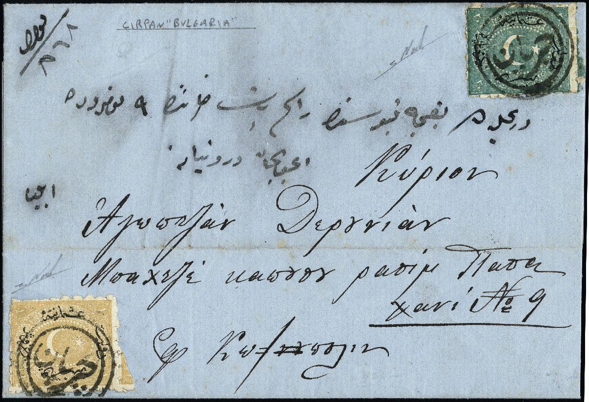 | Zusatzinformationen und Suchstichworte: | 378. Auktion Heinrich Köhler Auktionstermin 21.-26. März 2022 Los 4016 „Cirpan“, all arabic double circle in black, 2 crisp strikes on entire letter to Constantinople, franked with Duloz 1 pia. yellow and 20 pa. green, very fine and rare, opinion Todd AIEP (Isfila RR) Zuschlag 420,00 EUR |