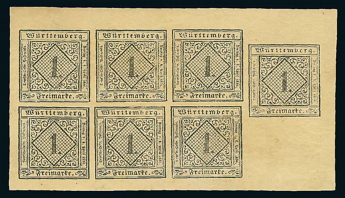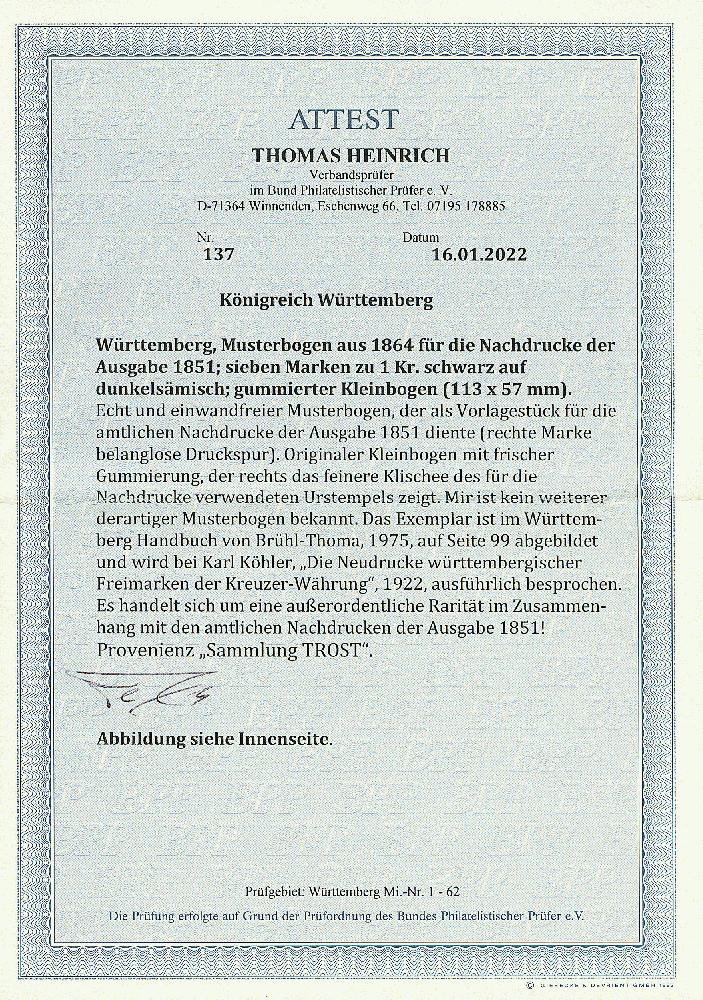 | Zusatzinformationen und Suchstichworte: | Dr. Derichs 166. Auktion - TROST V - Königreich Württemberg 22. Oktober 2022 Los 1444 Altdeutschland Württemberg \MUSTERBOGEN AUS 1864 FÜR DIE NACHDRUCKE DER AUSGABE 1851 = UNIKAT\: 1 Kreuzer schwarz auf dunkelsämisch, gummierter Kleinbogen (Format: 113 x 57mm) mit sieben Marken. Rechte Marke mit belangloser Druckspur, der linke Sechserblock in postfrischer Luxus-Qualität. Dieser Musterbogen diente als Vorlage für die AMTLICHEN Nachdrucke der Ausgabe 1851. Unsigniert, neues Fotoattest Heinrich BPP: "Echt und einwandfrei... Mir ist kein weiterer derartiger Musterbogen bekannt.". EIN MUSEALES STÜCK DER WÜRTTEMBERG-PHILATELIE. Referenzen: - Der Bogen wird bei Karl Köhler "Die Neudrucke württembergischer Freimarken der Kreuzer Währung" (1922) ausführlich besprochen. - Abgebildet im "Handbuch der Württemberg-Philatelie" (1975) von Brühl/Thoma auf Seite 99. |
