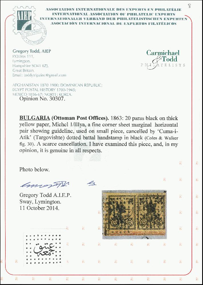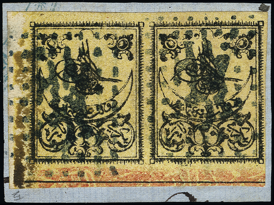 | Zusatzinformationen und Suchstichworte: | 378. Auktion Heinrich Köhler Auktionstermin 21.-26. März 2022 Los 4023 „CUMA-I ATIK“, dotted handstamp in black, 2 clear strikes on Tughra 3rd printing, horizontal pair with ample to very large margins and marginal guideline, used on small piece, very fine and scarce. Signed Pfenninger and opinion Todd AIEP (Isfila RRR) Ausruf 200,00 EUR |