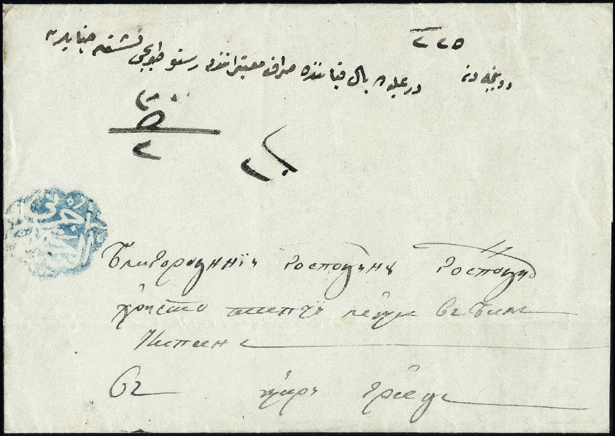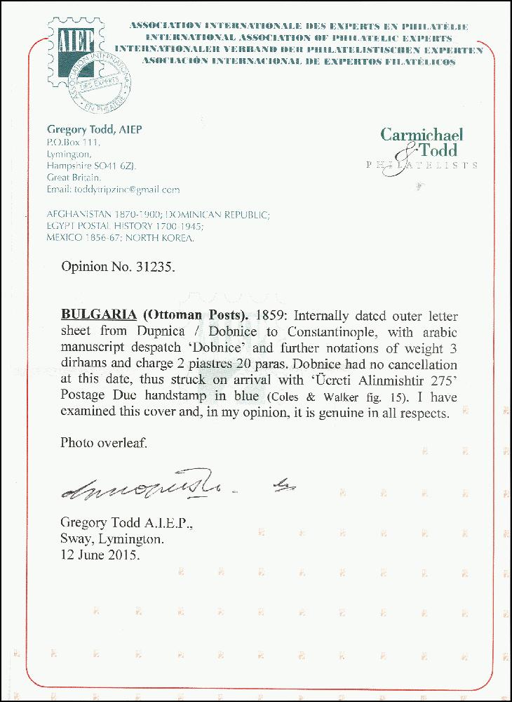 | Zusatzinformationen und Suchstichworte: | 378. Auktion Heinrich Köhler Auktionstermin 21.-26. März 2022 Los 4033 DOBNITCHE (Dupnitsa): 1859, dated lettersheet with arabic manuscript dispatch „Dobnice“ to Constantinople, upon arrival struck with postage due handstamp „Ücreti Alinmishtir 275“ in blue. Fine and very scarce. Opinion Todd AIEP Zuschlag 200,00 EUR |