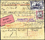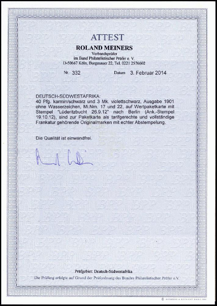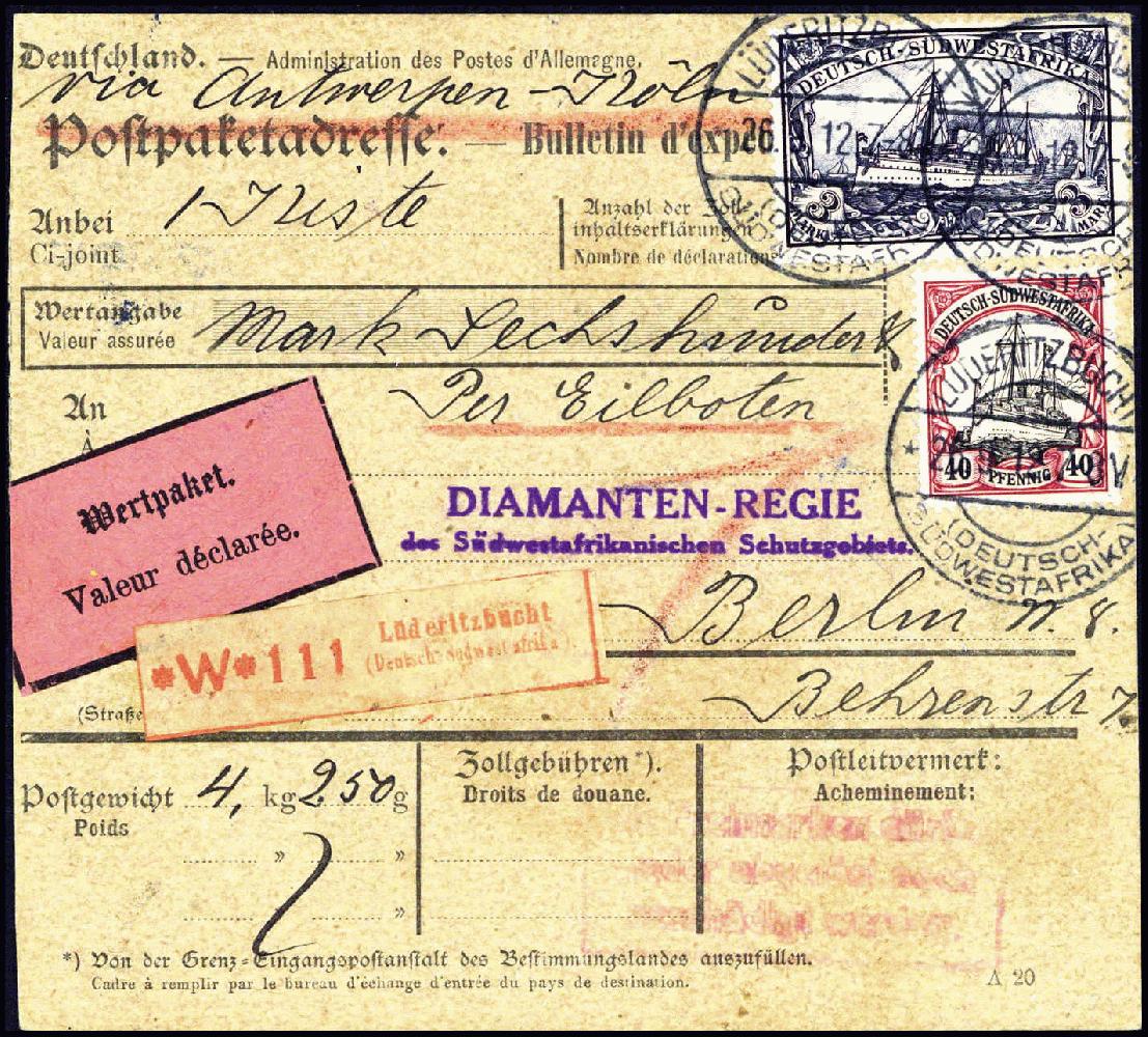 | Zusatzinformationen und Suchstichworte: | Württembergisches Auktionshaus 141. Versteigerung 10. Dezember 2022 Los 95 + Deutsche Kolonien Südwestafrika Wertpaketkarte der DIAMANTEN-REGIE: 40 Pfg. und 3 Mk., tadellose 3,40-Mark-Frankatur mit klaren Stempeln LÜDERITZBUCHT 26/9 12 auf Wertpaketkarte über 600 Mark mit spezieller Versendungsform "per Eilboten" nach Berlin, oben mit Leitvermerk "via Antwerpen - Köln" nebst zwei verschiedenen Wert-Aufklebern. Vs. und rs. mit L2 "Diamanten-Regie des Südwestafrikanischen Schutzgebiets". Die Frankatur setzt sich aus 2,40 Mark Paketporto (via Belgien), 60 Pfg. Versicherungsgebühr und 40 Pfg. Expresszuschlag zusammen. In dieser Versendungsform eine bemerkenswerte postgeschichtliche Seltenheit, Fotoattest Meiners BPP. Ausruf 1.500,00 EUR |