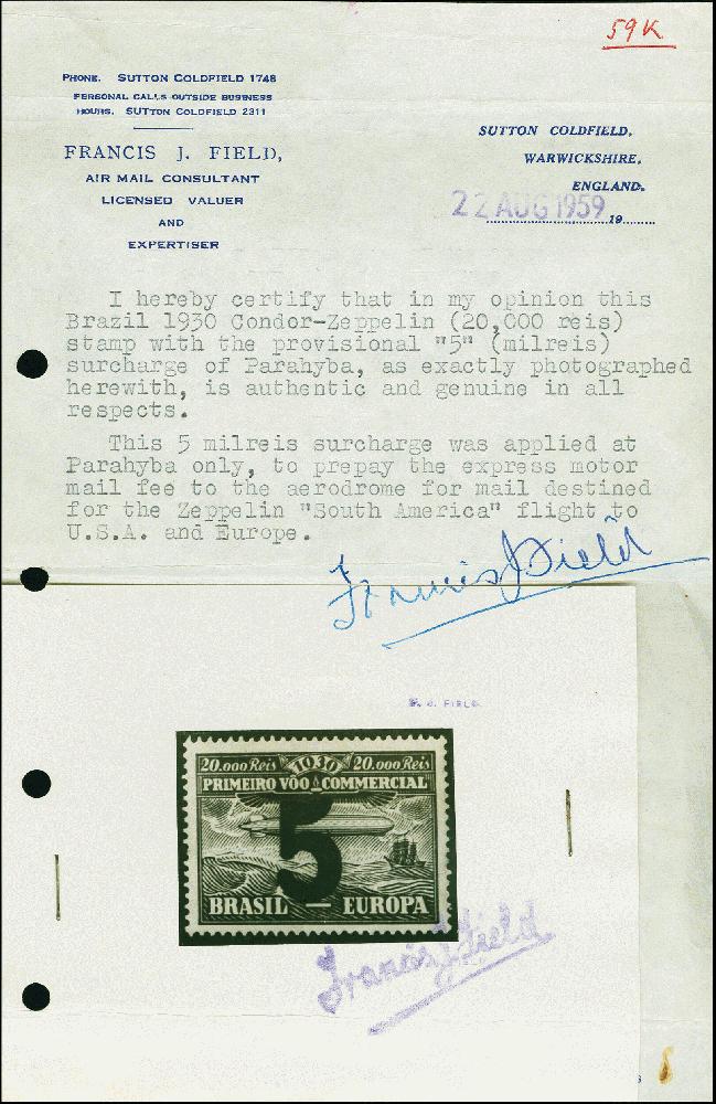 | Zusatzinformationen und Suchstichworte: | Heinrich Köhler 379. Auktion 19. - 24. September 2022 Los 1885 Brasilien 1930, Das Parahyba-Provisorium, Handstempel "5" auf 20000 R. blau, farbfrisch und bis auf eine ergänzte Zahnspitze links tadellos, ungebraucht mit originalem Gummi und Falzrest. Von dieser legendären Marke sind nur drei ungebrauchte Exemplare bekannt. Das hier angebotene ist das besterhaltene und unseres Wissens das einzige mit Originalgummierung. Eine der seltensten Luftpostmarken der Welt ! Sign. Francis.J.Field mit Fotoattest (1959), Fotoattest Corinphila (1964), Attest Sieger (1965) und sign. Arthur Falk mit Fotoattest (1980). Zuschlag 11.000,00 EUR |
