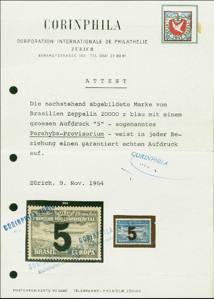 | Zusatzinformationen und Suchstichworte: | Heinrich Köhler 379. Auktion 19. - 24. September 2022 Los 1885 Brasilien 1930, Das Parahyba-Provisorium, Handstempel "5" auf 20000 R. blau, farbfrisch und bis auf eine ergänzte Zahnspitze links tadellos, ungebraucht mit originalem Gummi und Falzrest. Von dieser legendären Marke sind nur drei ungebrauchte Exemplare bekannt. Das hier angebotene ist das besterhaltene und unseres Wissens das einzige mit Originalgummierung. Eine der seltensten Luftpostmarken der Welt ! Sign. Francis.J.Field mit Fotoattest (1959), Fotoattest Corinphila (1964), Attest Sieger (1965) und sign. Arthur Falk mit Fotoattest (1980). Zuschlag 11.000,00 EUR |