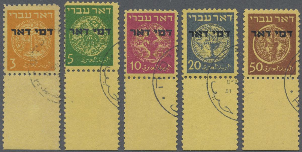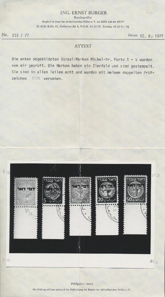 | Zusatzinformationen und Suchstichworte: | Christoph Gärtner 54. Auktion 18. Oktober 2022 Los 2332 D Israel 1948,3 M zu 50 M Portomarken, komplett gestempelter Satz von 5 Werten mit Tab. Prachterhaltung. Alle Marken signiert und mit Attest Ing. E. Burger. Mi. 1,500.- € RR! Ausruf 250,00 EUR |
