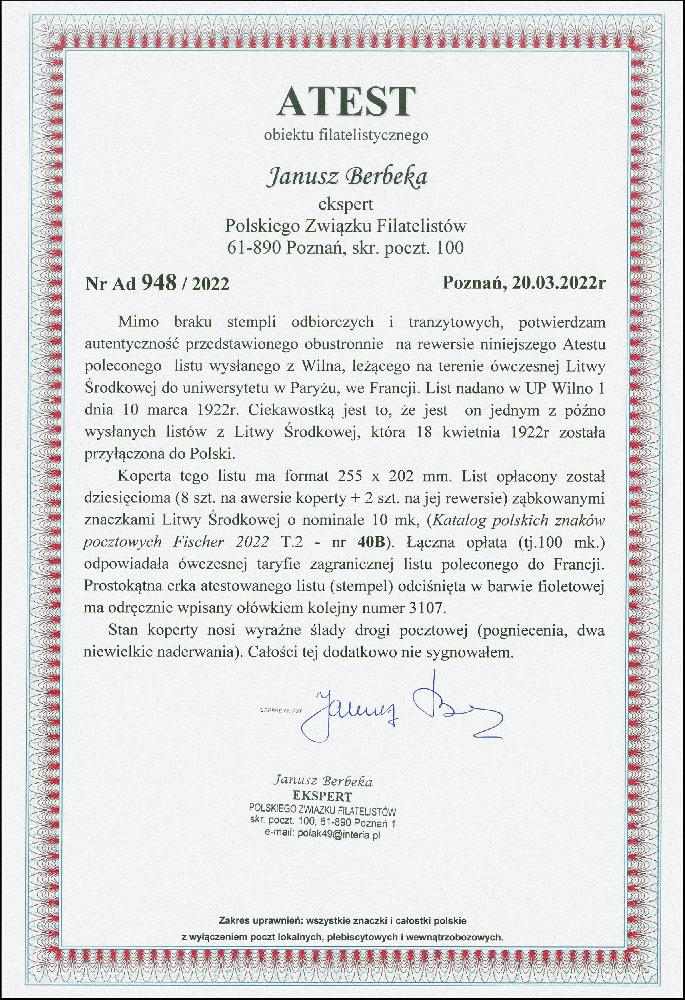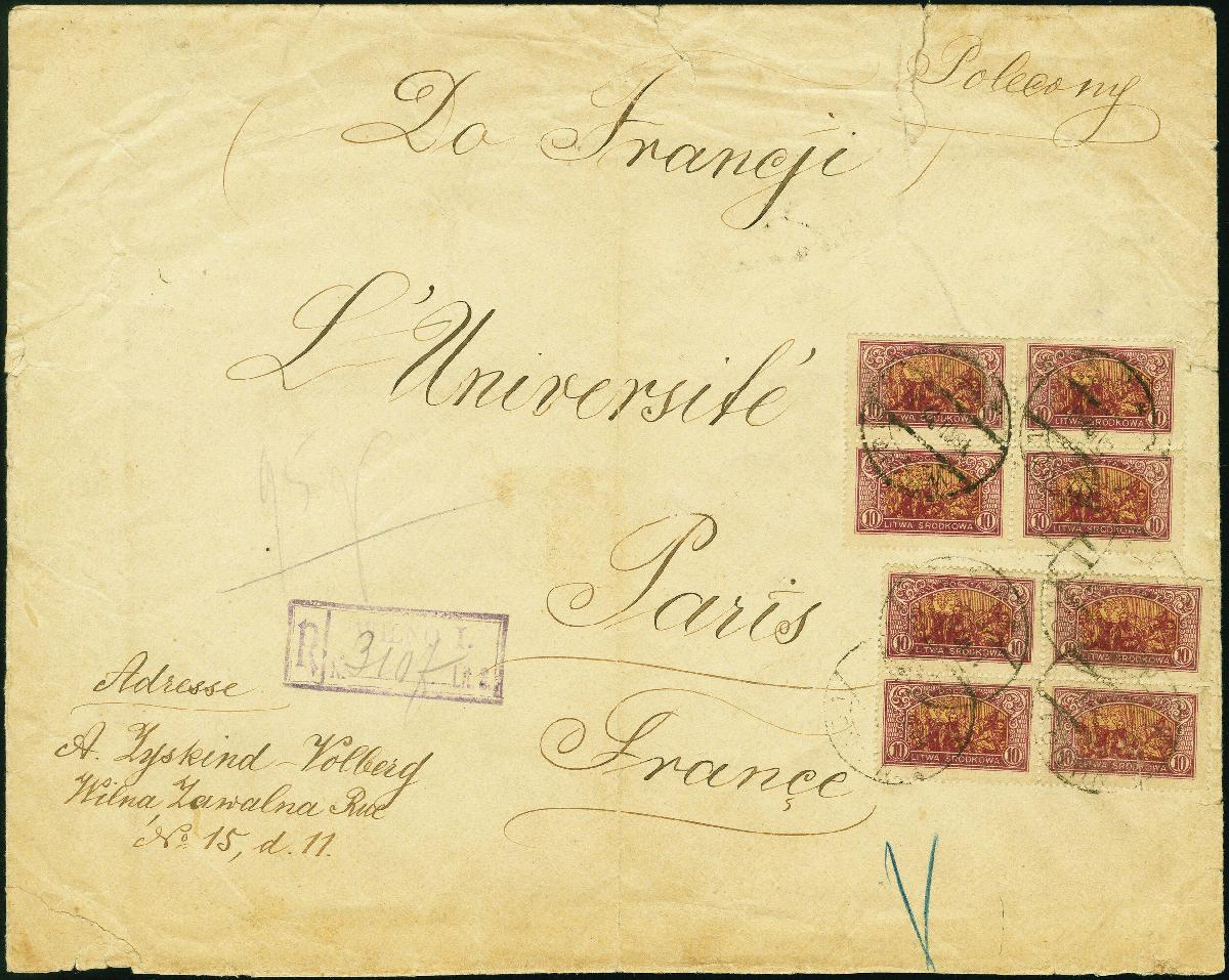| Zusatzinformationen und Suchstichworte: | Heinrich Köhler 379. Auktion 19. - 24. September 2022 Los 1025 Mittellitauen 1921, 10m. two blocks of four and two singles tied by cds. "WILNO 18.III.22" to front and reverse of large format registered cover to Paris, France, the stamps and covers some faults, scarce, certificate Berbeka (2022) Ausruf 1.000,00 EUR |