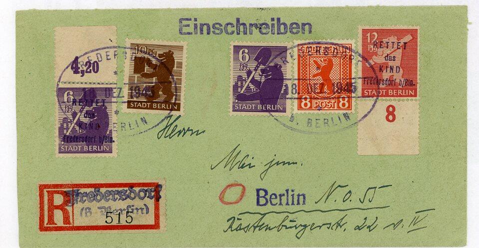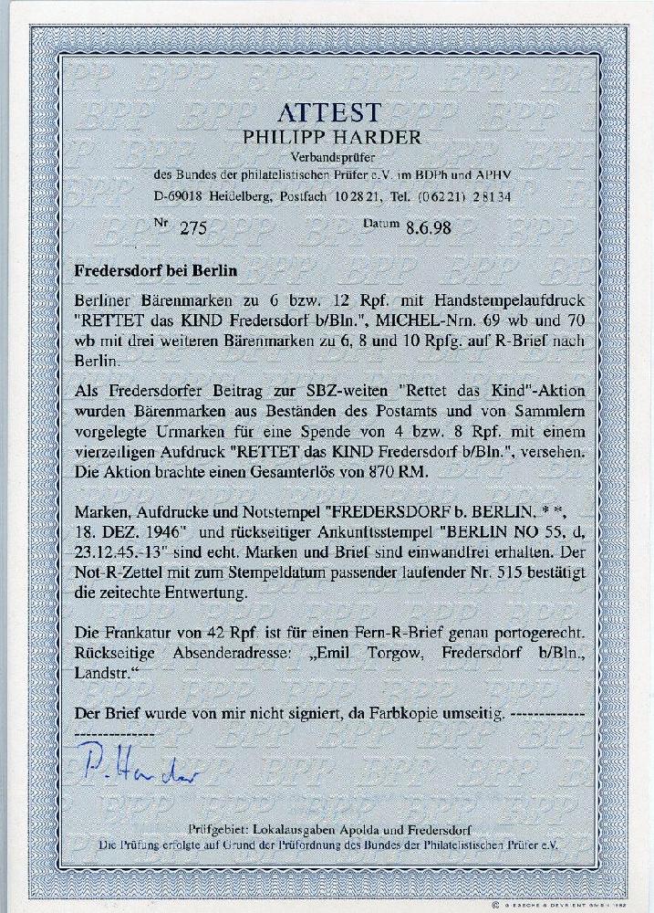 | Zusatzinformationen und Suchstichworte: | 24. Briefmarkenhandel Dessau Auktion 1. September 2022 Los 364 Deutsche Lokalausgabe Fredersdorf Fredersdorf - Kindermarken 6 und Pfg. mit Aufdruck in MiF mit Bären 6, 8 und 10 Pfg. auf R-Brief mit Notstempel vom 18.DEZ.1945 nach Berlin, Foto-Attest Harder BPP Ausruf 500,00 EUR |