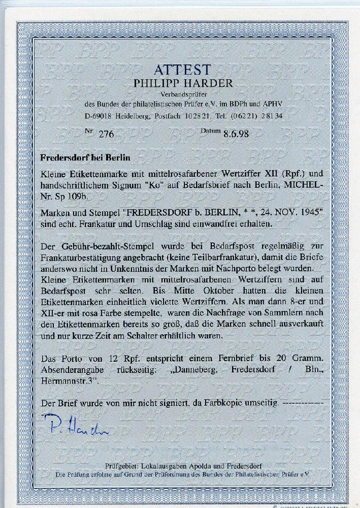 | Prüfgebiet: | Deutsche Lokalausgaben 1945 Fredersdorf |