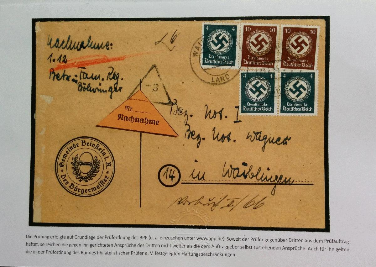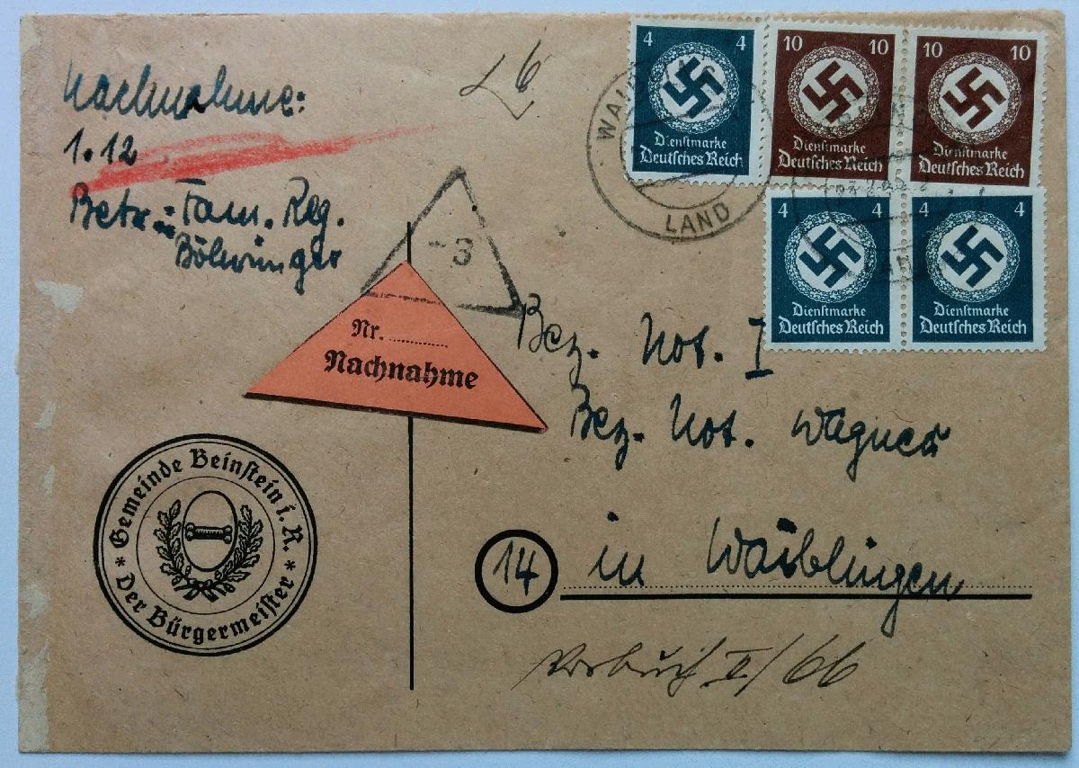 | Zusatzinformationen und Suchstichworte: | Nachnahme-Ortsbrief, 3 Marken Mi-Nr. 167 und 2 Marken Mi-Nr. 171 |