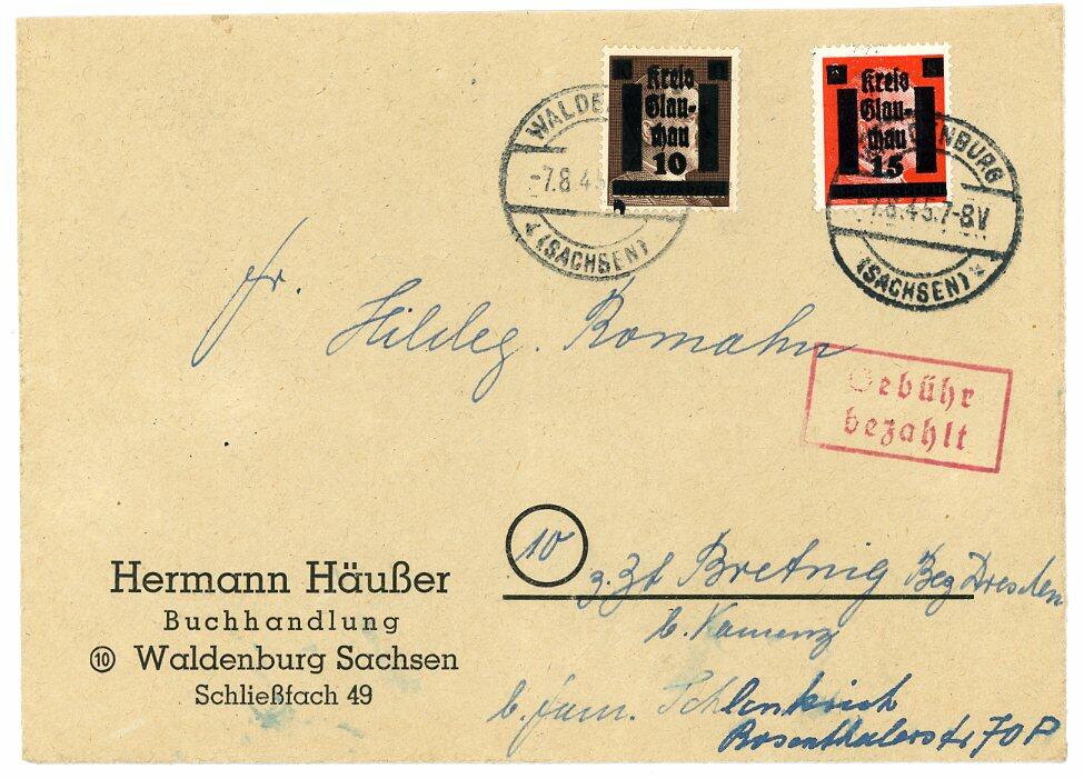 | Zusatzinformationen und Suchstichworte: | 24. Briefmarkenhandel Dessau Auktion 1. September 2022 Los 374 Deutsche Lokalausgabe Glauchau Glauchau - Überdruckmarke 15 Pfg. Hitler zinnober und 10 Pfg. siena (StTdr) auf Bedarfs-Fernbrief von "WALDENBURG 7.8.45" nach Brething Bez Dresden mit rot. Ra2 "Gebühr bezahlt" als Frankaturbestätigung und Schutz vor Nachgebührenforderung, da in der OPD Dresden ab dem 21.6.45 die Hitler-Marken nicht mehr anerkannt wurden Befund Busch BPP Ausruf 180,00 EUR |
