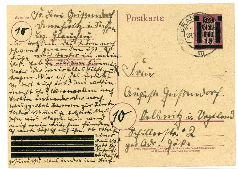 | Zusatzinformationen und Suchstichworte: | 24. Briefmarkenhandel Dessau Auktion 1. September 2022 Los 380 Deutsche Lokalausgabe Glauchau Glauchau - Überdruck-Ganzsache 15 auf 6 Pfg. Hitler als Fernpostkarte von "MEERANE 28.7.45" nach Oelsnitz, Bedarf, Befund Busch BPP Zuschlag 100,00 EUR |