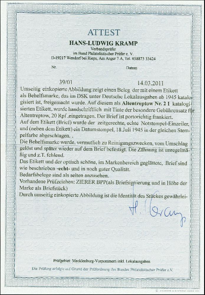 | Prüfgebiet: | Deutsche Lokalausgaben 1945 Altentreptow |