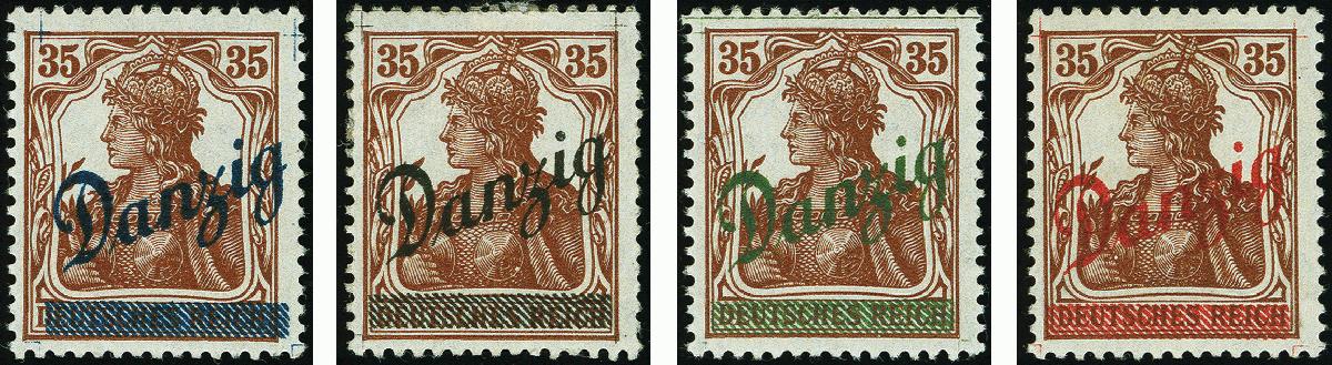 | Zusatzinformationen und Suchstichworte: | Heinrich Köhler 379. Auktion 19. - 24. September 2022 Los 3398 35 Pfg., vier Werte mit verschiedenfarbigen Aufdrucken in rot, grün, dunkelblau und schwarz, ungebraucht mit Originalgummi, sehr selten, die Marke mit dem roten Aufdruck signiert Seifert, Fotoattest Gruber BPP (2016) Ausruf 1.600,00 EUR |