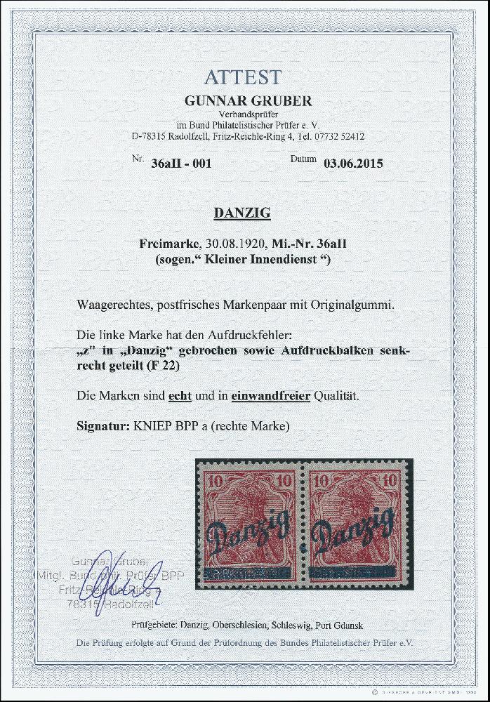 | Zusatzinformationen und Suchstichworte: | Heinrich Köhler 379. Auktion 19. - 24. September 2022 Los 3404 Kleiner Innendienst 10 Pfg. karminrot mit Aufdruckfehler z in Danzig gebrochen sowie Aufdruckbalken senkrecht geteilt" im waagerechten Paar mit Normalmarke, postfrisch, rechte Marke sign. Kniep BPP und Fotoattest Gruber BPP (2015) Ausruf 160,00 EUR |