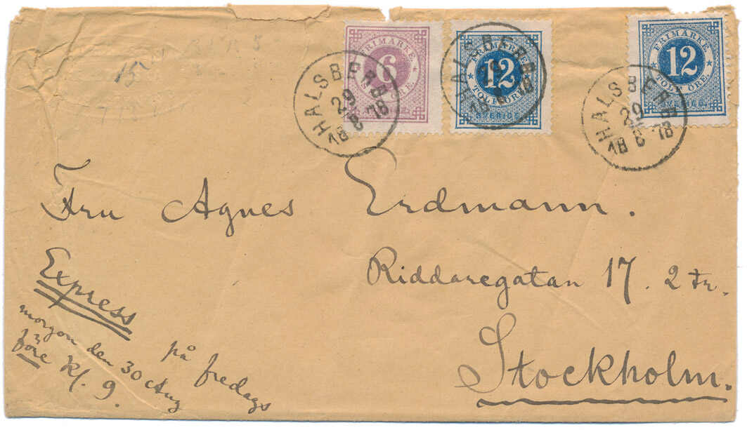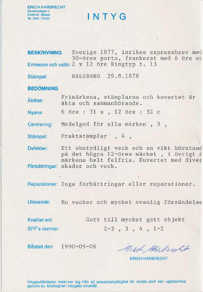 | Zusatzinformationen und Suchstichworte: | Postiljonen 237. Int. Briefmarken Auktion 29. September - 01. Oktober 2022 Decorative express cover with 6 öre red lilac together with two copies of 12 öre deep blue, three distinct "HALSBERG 29.8 1878". Small faults on one 12 öre and envelope with some faults. Cert. Harbrecht. SCARCE. Zuschlag 340,00 EUR |