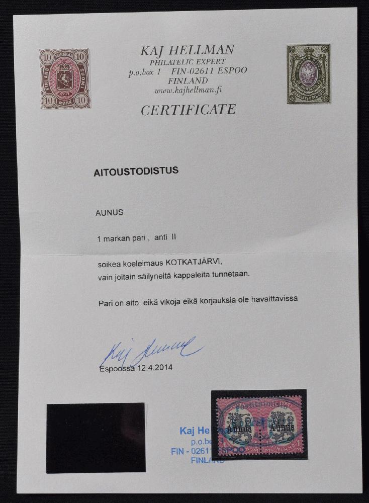 | Zusatzinformationen und Suchstichworte: | Hellman 126. Auktion 12. - 15. Oktober 2022 Los 2176 Finnland Besetzung Aunus (Olonez) Versuchsabstempelung: Kotkatjärvi oval Entwertung auf 1 markka Paar. Fein und selten! Meinung: Kaj Hellman (2014) Ausruf 100,00 EUR |