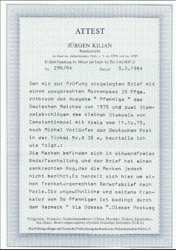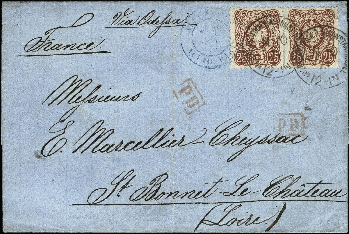 | Zusatzinformationen und Suchstichworte: | Heinrich Köhler 379. Auktion 19. - 24. September 2022 Los 3087 Deutsche Kolonien Neuguinea, Vorläufer 25 Pfg. rotbraun im waagerechten Paar mit EKr. "KDPA CONSTANTINOPEL 11 10 75" auf Briefhülle mit Leitvermerk "Via Odessa" nach Frankreich mit Transit- und Ankunftsstempeln. Die rechte Marken oben kleiner Ranspalt, sonst gute Erhaltung. Eine seltene Mehrfachfrankatur. Fotoattes Kilian BPP (1984) Provenienz: 190. Grobe-Auktion (1986) Zuschlag 160,00 EUR |