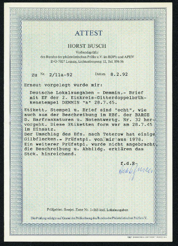 | Prüfgebiet: | Deutsche Lokalausgaben 1945 Demmin |