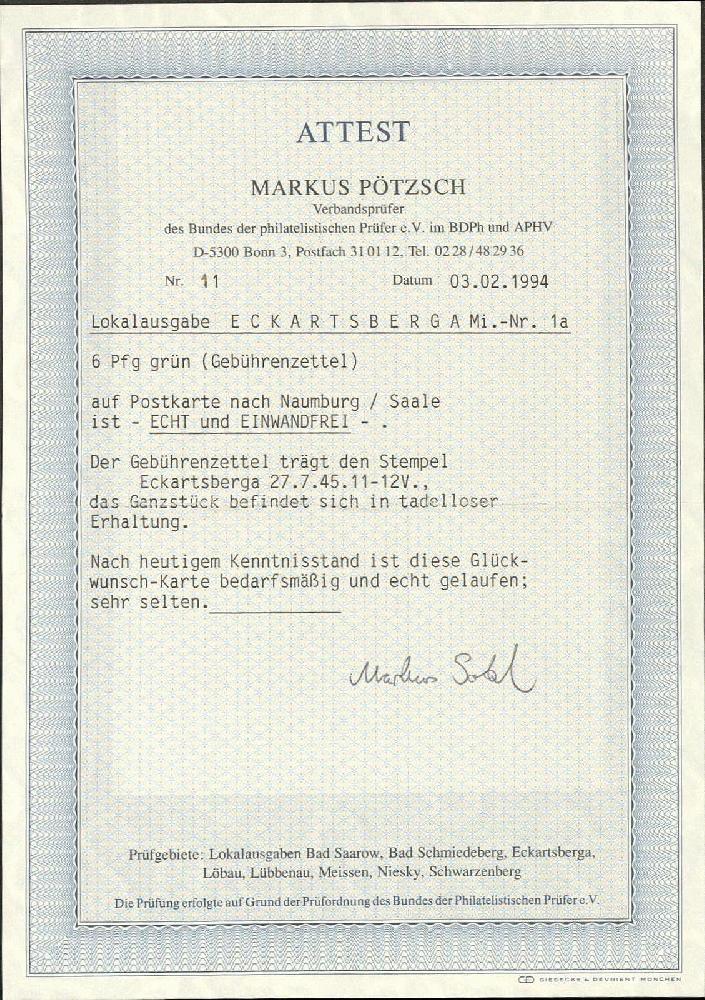 | Prüfgebiet: | Deutsche Lokalausgaben 1945 Eckartsberga |