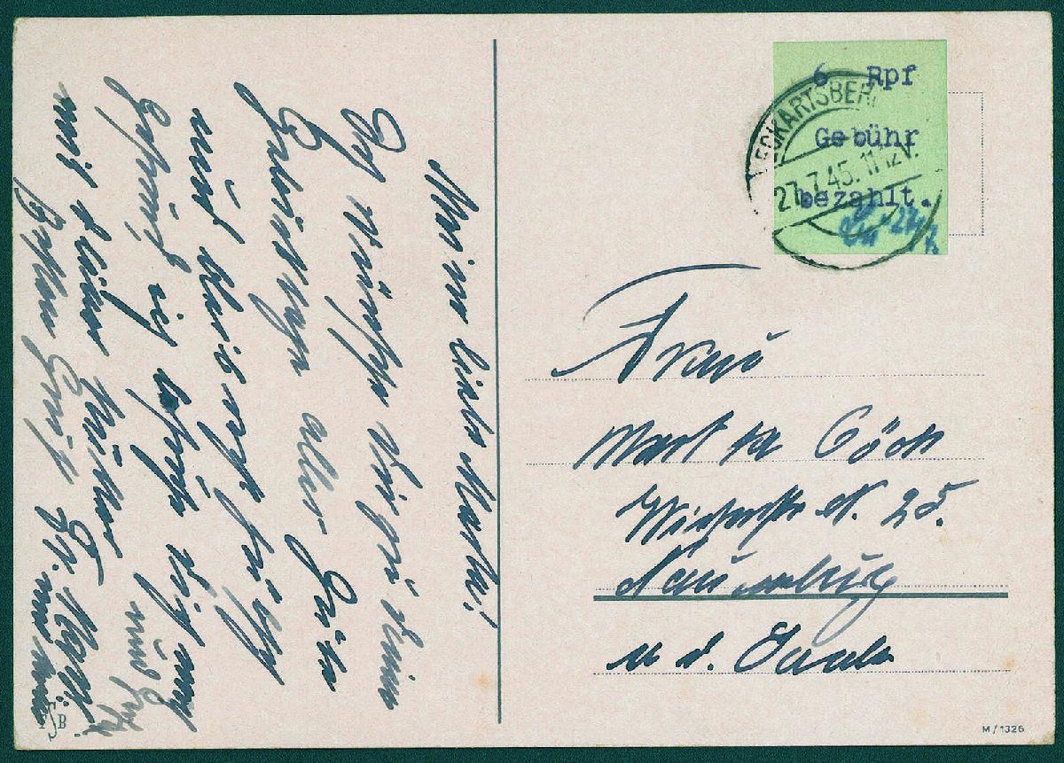 | Zusatzinformationen und Suchstichworte: | Gert Müller 115. Auktion 25. - 27. August 2022 Los 4482 Deutsche Lokalausgabe Eckartsberga 6 Pfg. schwarz auf grün, Signum Bu, farbfrisch und tadellos als enorm seltene portogerechte Einzelfrankatur auf bedarfsmäßig verwendeter Postkarte von "ECKARTSBERGA 27.7.45." (ganz frühes Datum, nur zwei Tage nach der Ausgabe) nach Naumburg. Von dieser Wertstufe sind nur ganz wenige Bedarfsbelege bekannt geworden, die zu den großen Raritäten der Deutschen Lokalausgaben zählen! Fotoattest Pötzsch BPP Ausruf 2.000,00 EUR |
