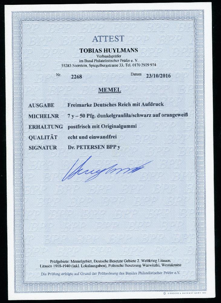 | Zusatzinformationen und Suchstichworte: | Klüttermann - 4. Auktion 28. Juli - 5. August 2022 Los 6192 Memel 50 Pfg. Germania auf orangeweiß, postfrisches Luxusstück mit FA Huylmans Katalogwert: 500 Ausruf 160,00 EUR |