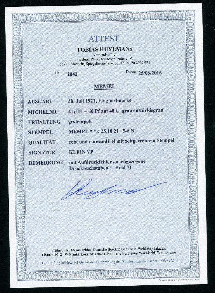 | Prüfer: | Huylmans, Tobias (BPP (Bund Philatelistischer Prüfer)) |
