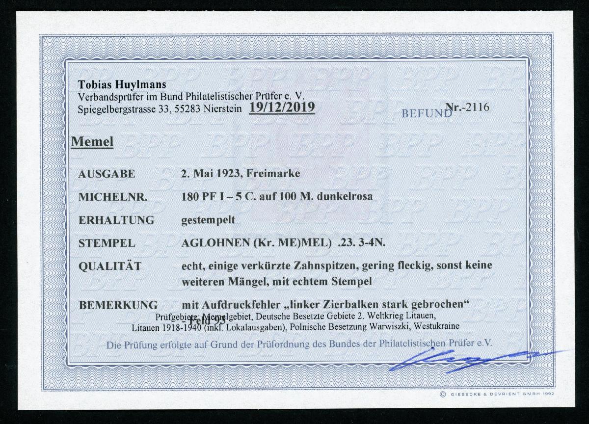 | Zusatzinformationen und Suchstichworte: | Klüttermann - 4. Auktion 28. Juli - 5. August 2022 Los 6226 Memel 5 C. a. 100 M. mit Plf. "linker Zierbalken stark gebrochen", sauber mit dt. Stempel AGLOHNEN, FBI Huylmans, einige verkürzte Zahnspitzen, gering fleckig, sonst keine weiteren Mängel Katalogwert: 280 Zuschlag 70,00 EUR |