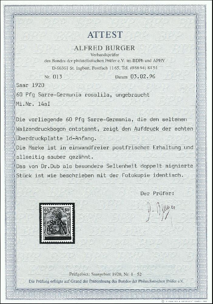 | Prüfgebiet: | Saargebiet (Mi-Nr. 1 - 205) |