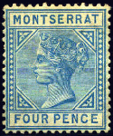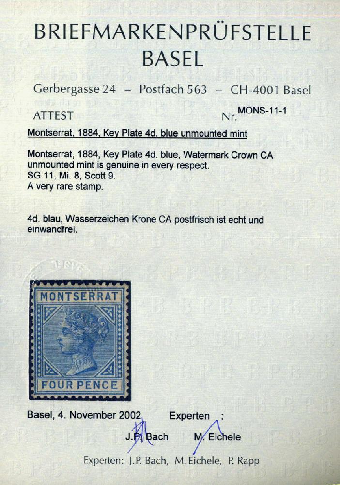 | Zusatzinformationen und Suchstichworte: | 75. AAK Phila GmbH Auktion 9. September 2022 Los 112 D Montserrat 4 P blau m. vollem Orig´gummi, u.E. mit winzigster Gummihaftung, daher von uns als ungebr. Luxus bewertet m. einwandfreiem Attest BPSB für eine postfr. Marke! übl. unregelm. Zähnung, seltenster Spitzenwert dieses Sammelgebietes! Ausruf 500,00 EUR |