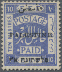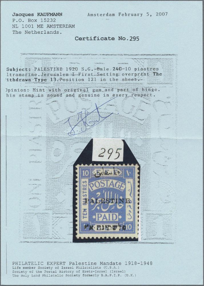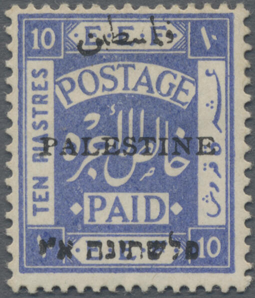 | Zusatzinformationen und Suchstichworte: | Christoph Gärtner 54. Auktion 18. Oktober 2022 Los 2503 D Palästina 1920, Jerusalem erste Fassung Überdruck, 10 pi. ultramarin, die seltene zurückgezogen Typ 13 (Position. 121 im Bogen), farbfrisch und gutzähnige, ungebrauchter Originalgummi mit Falzresten. Attest Jacques Kaufmann. Ausruf 200,00 EUR |