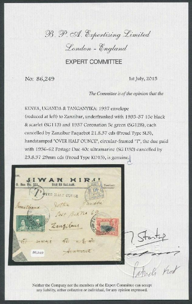 | Zusatzinformationen und Suchstichworte: | Auktionshaus Weiser 126. Fernauktion 14. Juli 2023 Los 4210 Sansibar Sansibar-Portomarken 1936, 40 C. ultramarin, auf Firmenbrief von Dar-es-Salam nach Sansibar, 1937 gelaufen, Frankatur Ostafrikanische Gemeinschaft 5 C. und 15 C., mit Paquebot-Zanzibar-Stempel, Nebenstempel (K 1) 'T' und (L1) 'OVER HALF OUNCE', deshalb die Nachgebühr - BPA-Attest. Die Anzahl der Belege mit Portomarken dieser Serie ist extrem gering, dieser besonders seltene 40 C.-Wert ist vermutlich in korrekter Verwendung ein Unikat! - absolutes Ausnahmestück der Sanaibar-Philatelie! (Mi.Nr. P23, Ostafr.-Ges. 34,49) (5) Ausruf 4.200,00 EUR |