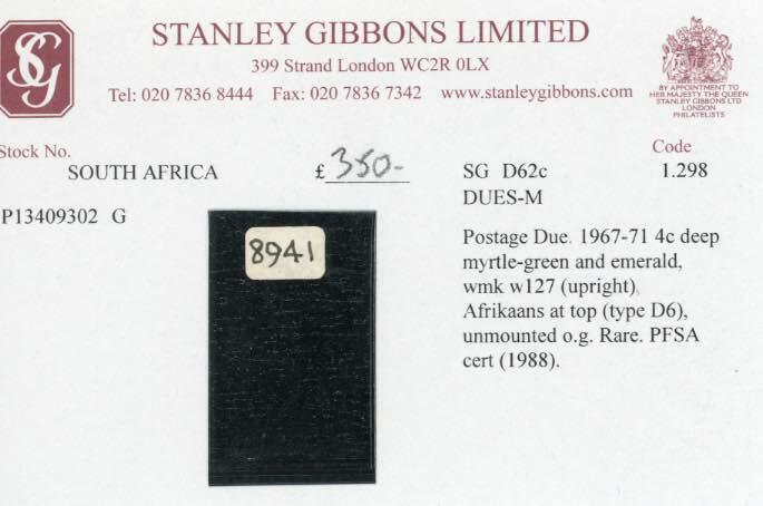 | Zusatzinformationen und Suchstichworte: | 26. Ferrario Auktion 1. Oktober 2022 Los 2245 Südafrika SOUTH AFRICA POSTAGE DUE 1967/71 - 4 cent. deep myrtle green and emerald, wmk w127 upright, type D6 (S.G.62C), mint never hinged, original gum, very fine. Attest of Philatelic Federation of Southern Africa Ausruf 100,00 EUR |