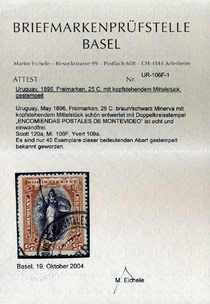 | Zusatzinformationen und Suchstichworte: | 75. AAK Phila GmbH Auktion 9. September 2022 Los 138 (D) Uruguay 25 C Minerva m. sehr seltener Abart "kopfstehendes Mittelstück" rundgest. Pracht Montevideo mit einwandfreien Attesten Fausto Diaz Paulos u. BPSB "nur 40 gestpl. Exemplare bekannt" Zuschlag 720,00 EUR |