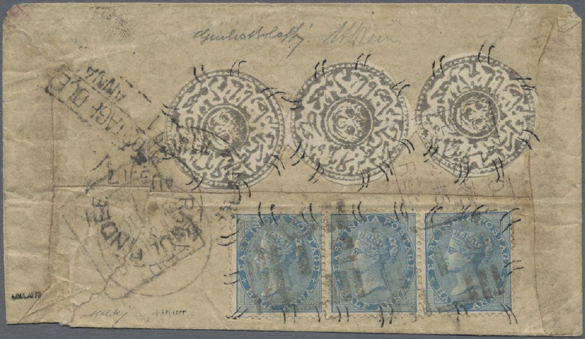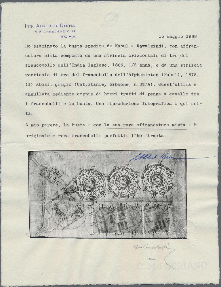 | Zusatzinformationen und Suchstichworte: | Christoph Gärtner 54. Auktion 18. Oktober 2022 Los 2004 D Afghanistan 1876,1293 erster Post Office Ausgabe, verausgabt in Kabul, Abasi grau, Dreierstreifen (Platte B, Position 23,19 und 15) kombiniert mit 1865 Indien ½ ein blau, Dreierstreifen, auf dreifachem Gewicht Brief aus Kabul zu Rawalpindi, jede Marke mit kleinem Tinte Stempeln plus Indien Briefmarke mit üblich Balken Stempeln, ein seltene Frankatur in sehr guter Erhaltung, signiert G. Bolaffi, Attest A. Diena (1968). Ausruf 2.500,00 EUR |