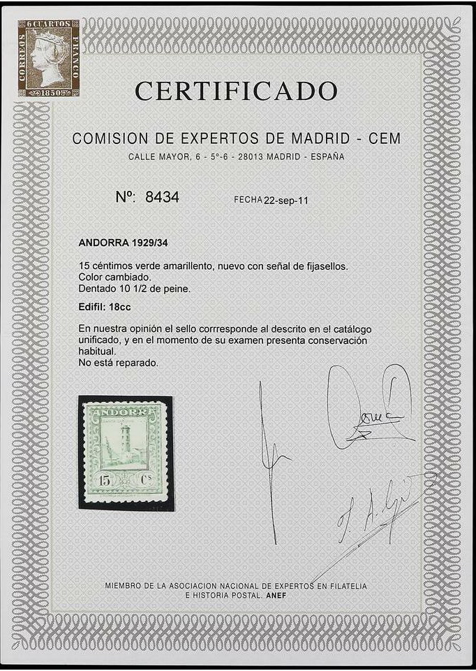 | Zusatzinformationen und Suchstichworte: | Soler y Llach - 779. Auktion - Spanien und Kolonien 17. - 18. Oktober 2022 Los 1375 Andorra Spanische Post ANDORRA. 15 céntimos verde amarillo COLOR CAMBIADO (dent. 11 1/2). Cert. CEM (2011). Ed.18cc. Cat. +490. Ausruf 50,00 EUR |