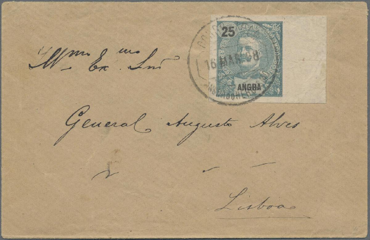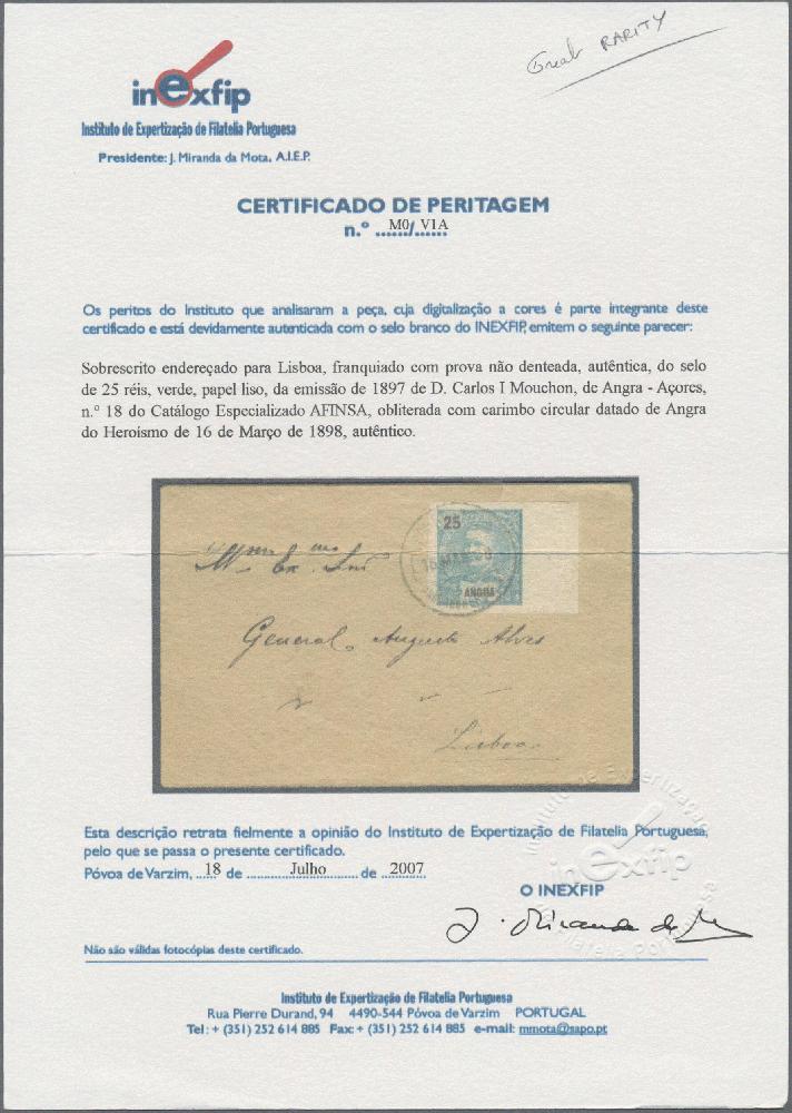 | Zusatzinformationen und Suchstichworte: | Christoph Gärtner 54. Auktion 18. - 19. Oktober 2022 Los 4223 D Angra 1897, Carlos 25 r. grünlichschiefer/schwarz, ungezähnt rechtes Randstück Probe postalisch verwendet auf Brief aus "ANGRA tun HEROISMO 16 MAR 98" nach Lissabon. Attest Inexfip. Ausruf 200,00 EUR |