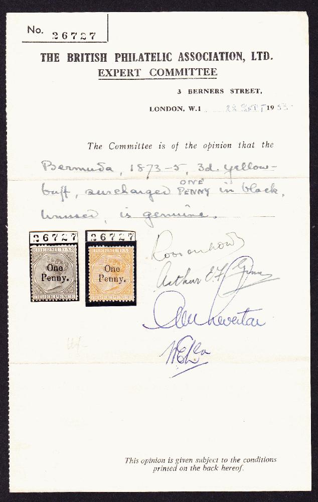| Zusatzinformationen und Suchstichworte: | Weggler Shop Los 0000100095 Bermuda 1875 1 penny Aufdruck auf 3d orange, ungebraucht. Altes Zertifikat B P A Nr. 26727 sowie Attest Holcombe welches besagt "nicht Originalgummi" Festpreis 190,00 CHF |