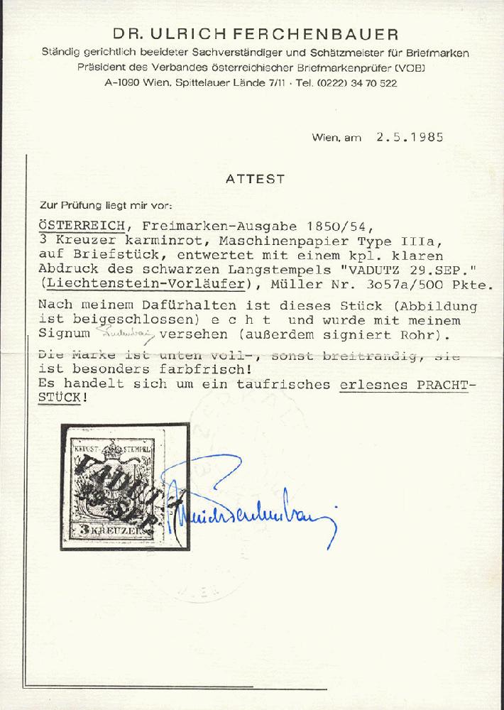 | Zusatzinformationen und Suchstichworte: | Merkurphila 50. Auktion 27. August 2022 Los 210 Österreichische Marken in FL verwendet Österreich, 1850, VADUTZ, 500 p, kompletter, klarer Stempel des Zweizeilers auf 3 M III, karminrot, voll- bis breitrandig auf attraktivem erlesenem Prachtbriefstück!, Attest Dr. Ferchenbauer Ausruf 300,00 EUR |