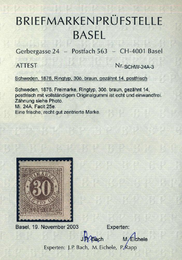 | Zusatzinformationen und Suchstichworte: | 75. AAK Phila GmbH Auktion 9. September 2022 Los 740 (D) Schweden Ziffer im Kreis Ausgabe 30 Ö braun m. vollem Orig´gummi, etw. stumpfe Zhg., von uns als ungebr. Luxus bewertet, da wohl winziger Springfalz m. einwandfreiem Attest BPSB für eine postfr. Marke! Ausruf 100,00 EUR |