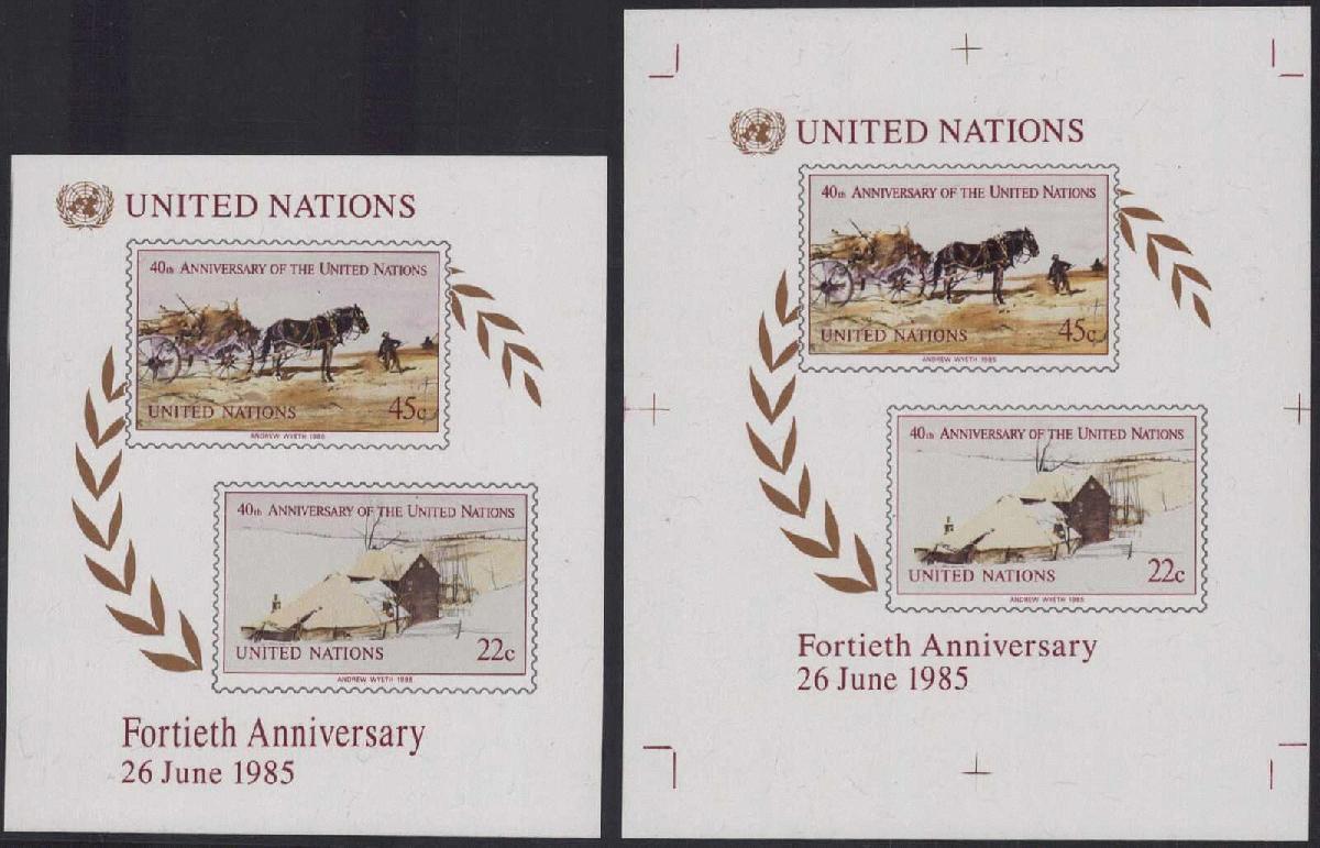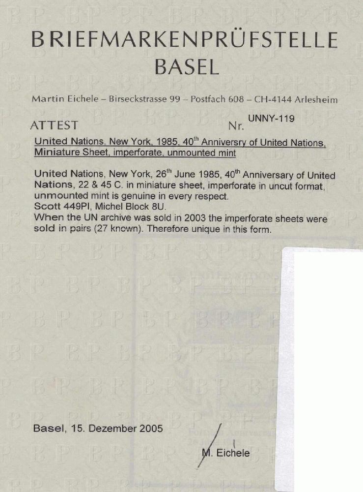 | Zusatzinformationen und Suchstichworte: | 41. Jean-Paul Bach Auktion 17.-20. November 2022 Los 596 UNO New York 1985, 40 th Anniversry of United Nations, Miniature Sheet, imperforate, unmounted mint. When the UN archive was sold in 2003 the imperforate sheets were sold in pairs (27 known). Therefore unique in this form. Ungezähnter Block, in dieser Form Unikat, fehlerfreie Erhaltung. Attest BP. Ausruf 1.500,00 CHF |