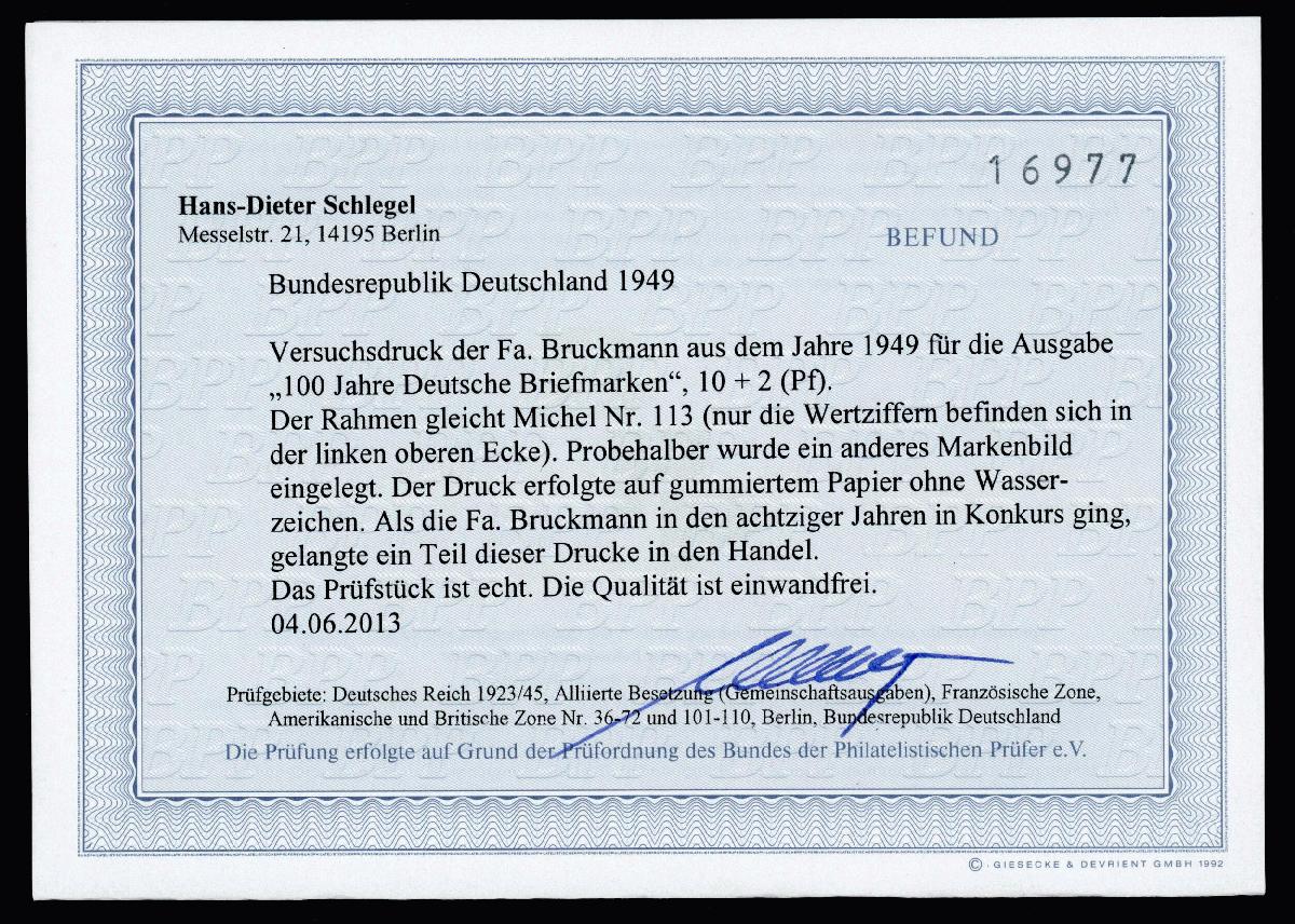 | Zusatzinformationen und Suchstichworte: | Klüttermann - 4. Auktion 28. Juli - 5. August 2022 Los 8125 Bundesrepublik Deutschland Probedruck 10 Pfg. Tag der Briefmarke ohne Wz. der Fa. Bruckmann, tadellos postfr., FB Schlegel Zuschlag 40,00 EUR |