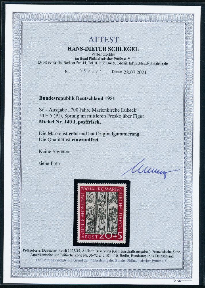 | Zusatzinformationen und Suchstichworte: | Klüttermann - 4. Auktion 28. Juli - 5. August 2022 Los 8261 Bundesrepublik Deutschland 20 Pfg. Marienkirche mit Plf. "Sprung im Fenster", tadellos postfr., FA Schlegel (2021) "einwandfrei" Katalogwert: 650 Ausruf 180,00 EUR |