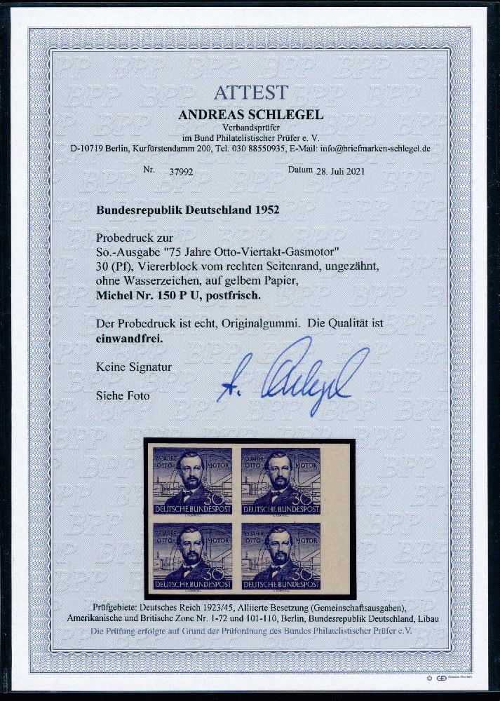 | Zusatzinformationen und Suchstichworte: | Klüttermann - 4. Auktion 28. Juli - 5. August 2022 Los 8320 Bundesrepublik Deutschland 30 Pfg. Otto, geschnittener Probedruck ohne Wz. im tadellos postfr. re. Rand-4erBlock, FA Schlegel (2021) Katalogwert: 3200 Ausruf 800,00 EUR |