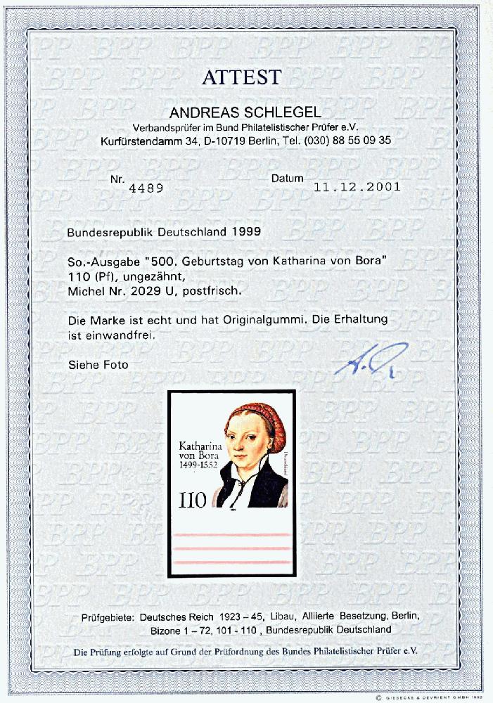| Zusatzinformationen und Suchstichworte: | 185. Dresdner Briefmarken Auktion 21.-22. September 2022 Los 2460 Bundesrepublik Deutschland Katharina von Bora. 110 Pfg. ungezähnt vom Unterrand, postfrisch, Attest vom 11.12.01 "echt und einwandfrei" Schlegel BPP Zuschlag 27,00 EUR |